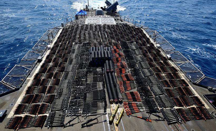 Merkezi Bahreyn’de bulunan 5. Filo’dan yapılan açıklamada “Silah sevkiyatında onlarca Rus yapımı tanksavar güdümlü füze, binlerce Çin yapımı Tip 56 saldırı tüfeği ve yüzlerce PKM makineli tüfek, keskin nişancı tüfekleri ve roket güdümlü el bombaları (RPG) bulunuyordu” ifadeleri kullanıldı.