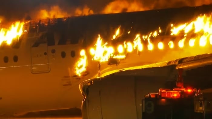 Japonya devlet televizyonu NHK'nin yayınladığı görüntülerde, uçağın pencerelerinden çıkan alevler kaydedildi.