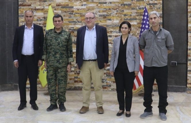 PeyamaKurd - ABD Dışişleri Bakanlığı’ndan bir heyetin, Rojava Özerk Yönetimi’ni ziyaret ettiği ve SDG Genel Komutanı Mazlum Kobani ve DSM Yürütme Kurulu Başkanı İlham Ahmed ile bir araya geldiği bildirildi.