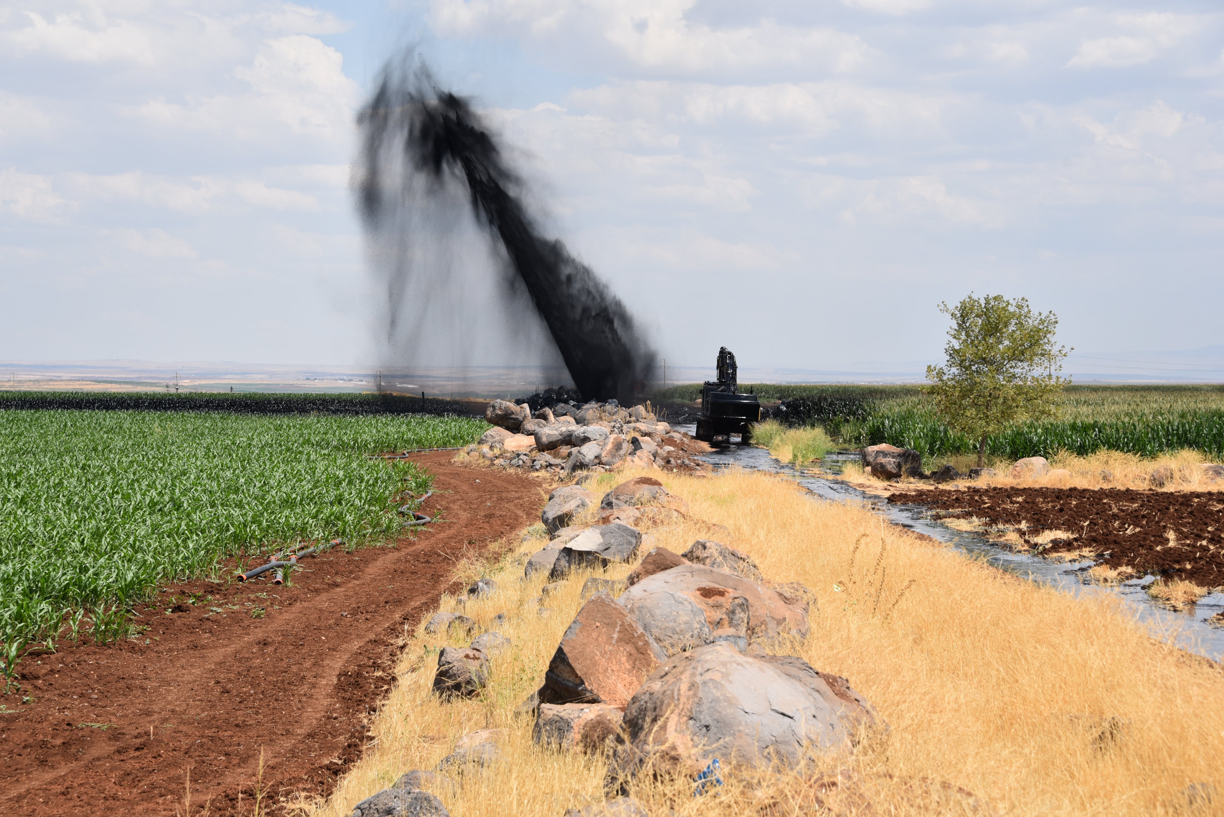 Olayın bölgede arazideki taşları temizleyen iş makinesi operatörünün, yanlışlıkla mahalleden geçen petrol boru hattını delmesiyle meydana geldiği belirtildi.