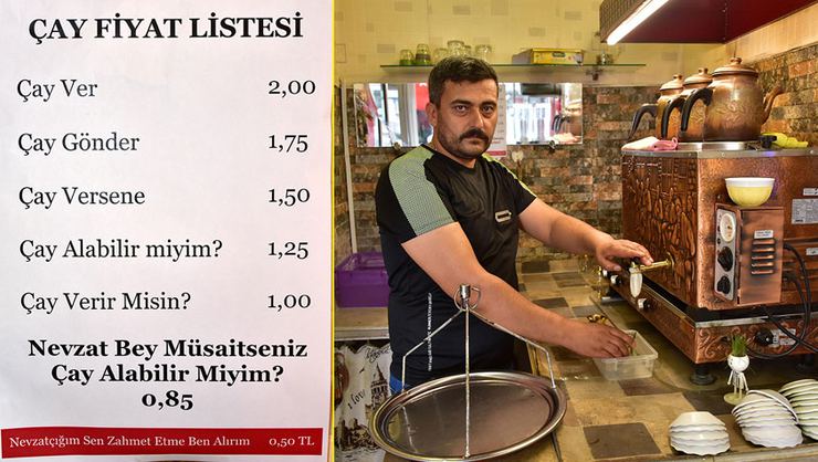 Nezaket kurallarına göre 7 çeşit fiyat tarifelendiren Adıgüzel, "Birçok müşteri artık çay talep ederken kaba cümleler sarf ediyor. Bende unuttuğumuz nezaket kurallarını hatırlatmak için böyle bir fiyat tarifelendirmesi yaptım.