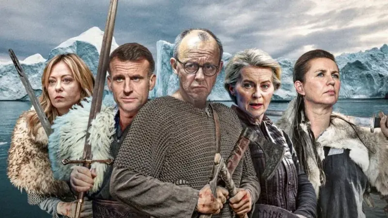 Grönland'ın arka planda bulunduğu illüstrasyonda sırayla; İtalya Başbakanı Giorgia Meloni, Fransa Cumhurbaşkanı Emmanuel Macron, Almanya Şansölyesi Friedrich Merz, Avrupa Komisyonu Başkanı Ursula von der Leyen ve Danimarka Başbakanı Mette Frederiksen yer aldı.