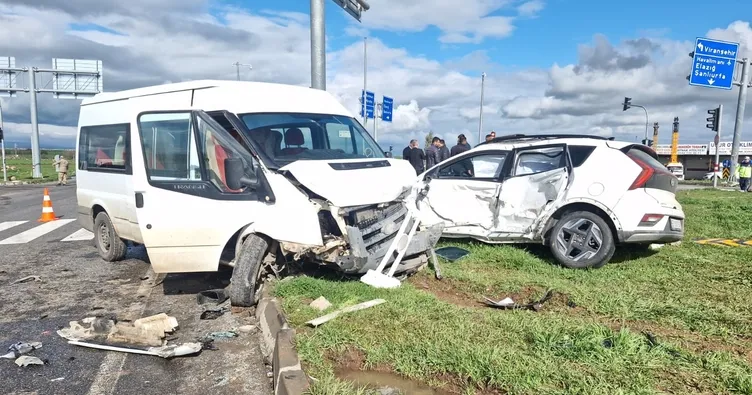 Diyarbakır'da servis minibüsü ile otomobilin çarpıştığı ve 15 kişinin yaralandığı kaza, güvenlik kamerasına yansıdı.