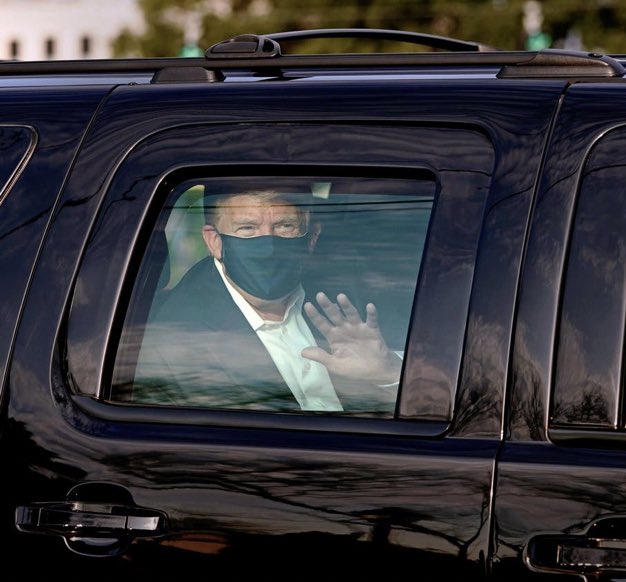 Video mesajının yayınlandığı esnada Gizli Servis araçlarının koruması eşliğinde hastane önündeki caddede beliren Trump, bulunduğu aracın içinden, kendisini destekleyenleri el sallayarak selamladı. Trump'ın, aracın içinde maskeli olması dikkat çekti.