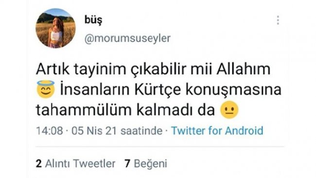 Paylaşımında Kürtçe'ye tahammül edemediğini belirten şahıs, "Artık tayinim çıkabilir mi Allah'ım. İnsanların Kürtçe konuşmasına tahammülüm kalmadı" ifadelerini kullandı.