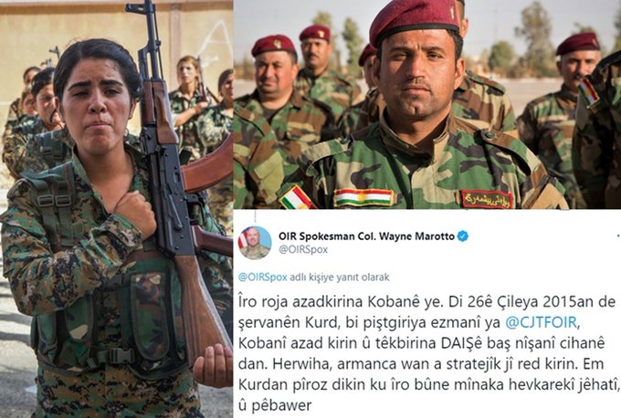 Îro roja azadkirina Kobanê ye. Di 26ê Çileya 2015an de şervanên Kurd, bi piştgiriya ezmanî ya @CJTFOIR, Kobanî azad kirin û têkbirina DAIŞê baş nîşanî cihanê dan. Herwiha, armanca wan a stratejîk jî red kirin. Em Kurdan pîroz dikin ku îro bûne mînaka hevkarekî jêhatî, û pêbawer pic.twitter.com/Azfzidnpyl