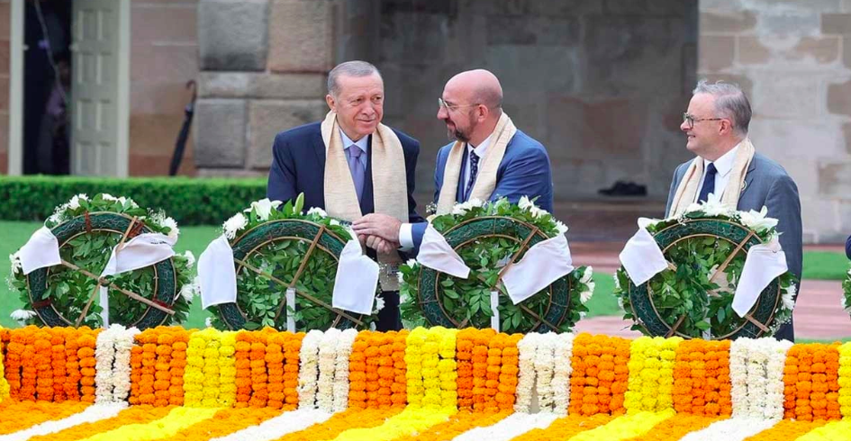 Gandhi'nin en sevdiği ilahilerin dinletildiği ziyaretin ardından Erdoğan ve diğer liderler, zirvenin gerçekleştiği Bharat Mandapam Uluslararası Fuar ve Kongre Merkezi'ne geçti.