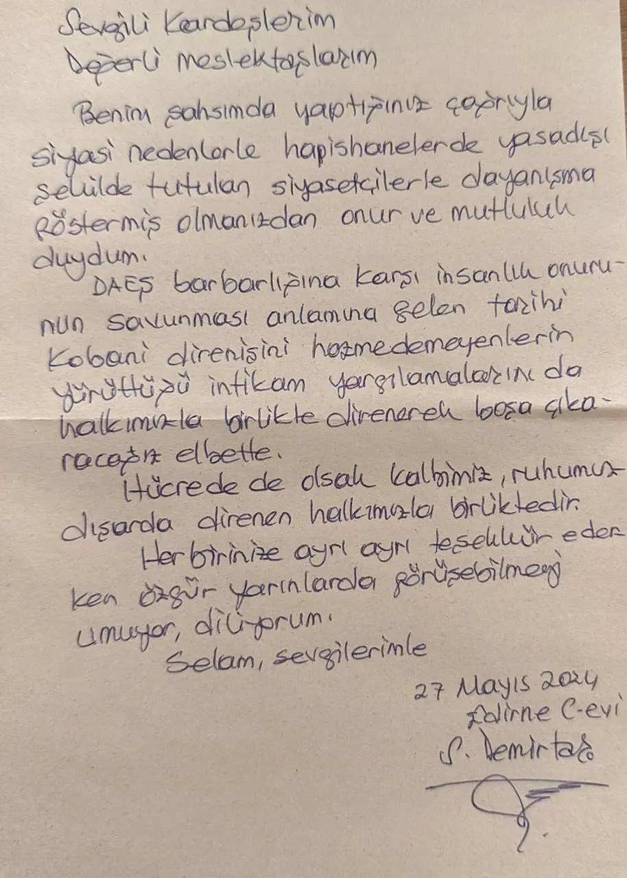 Selahattin Demirtaş ise, Rojavalı avukatlara gönderdiği mektupla teşekkür etti.