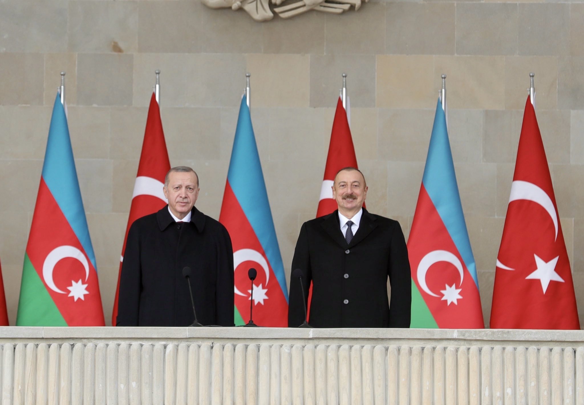 Azerbaycan'da düzenlenen törene katılan Erdoğan, "Karabağ’ı sinemizde yara eğledik. Bugüne kadar siyasi ve askeri alanda sürdürülen mücadele bundan sonra çok daha farklı cephelerde devam edecektir" dedi.