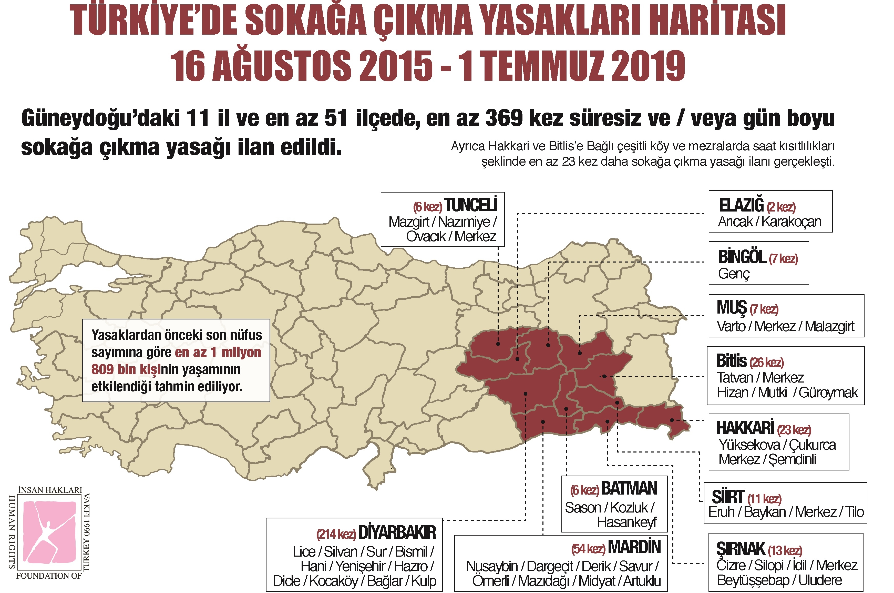 Türkiye İnsan Hakları Vakfı (TİHV) Dokümantasyon Merkezi verilerine göre, sokağa çıkma yasaklarının süresiz ve/veya gün boyu uygulanmaya başlandığı ilk tarih olan 16 Ağustos 2015’ten 1 Temmuz 2019’a kadar geçen süre içerisinde toplam 11 il ve en az 51 ilçede tespit edilebilen en az 369 resmi sokağa çıkma yasağı ilanı gerçekleşti.