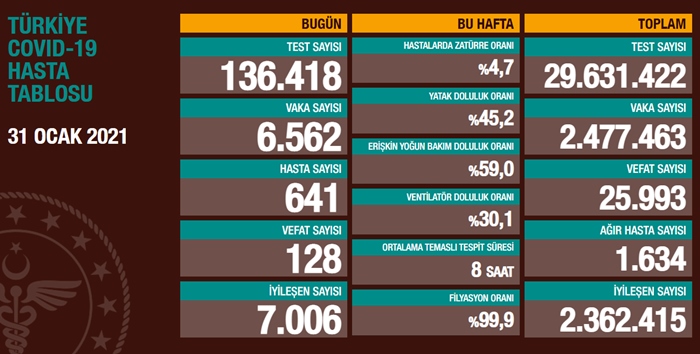 Wezareta Tenduristiya Tirkiyê di tabloya îro 31ê Çileyê 2021ê de ragihand, di nav 24 saetên borî de 128 kesên din ji ber vîrusa koronayê Covid-19 mirine û 641 ji wan yên nexweş 6 hezar û 562 kesên din jî bi koronayê ketine.