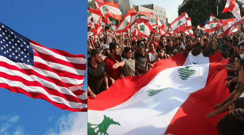 Xelkê ku tevlî xwepêşandanê bûn ala Lubnanê û ya Amerîkayê hilgirtin.