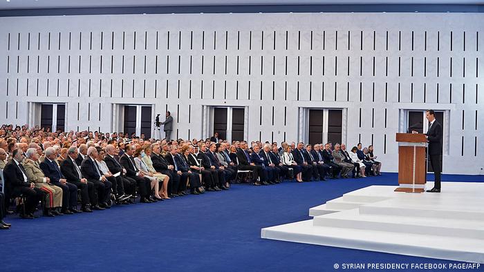 Esed li Şamê di Koşka serokatiyê de li ser destûr û Quranê sondê xwar. Di merasimê de 600 kes ji kesayetiyên olî, parlementer, pilebilindên artêşê, karsaz, akademisyen û rojnamevan hebûn.