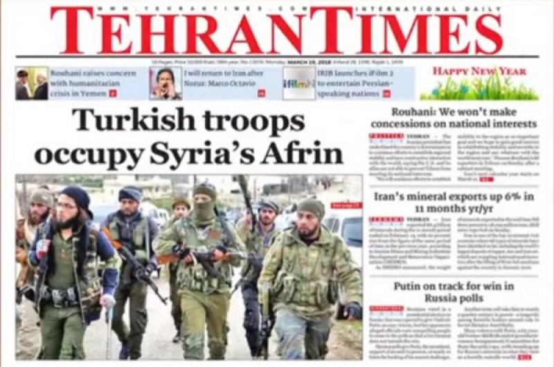 Rojnameya Tehran Times ku li Îranê tê weşandin, Operasyona Tirkiyê ya li ser Efrînê weke “Dagirkerî” kire manşet.