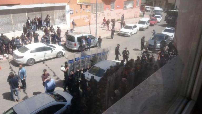 Avahiya HDPê dibin ablûkeyek mezin a polîs, maşîneyên zirxî û TOMAyan de ye. Ji bo ku rojnameger dîmen û wêneyên parlamenter û hevşaredaran nekêşin, mertalên xwe bilind kirin û dûre rojnameger ji ber avahiyê dûr xistin.
