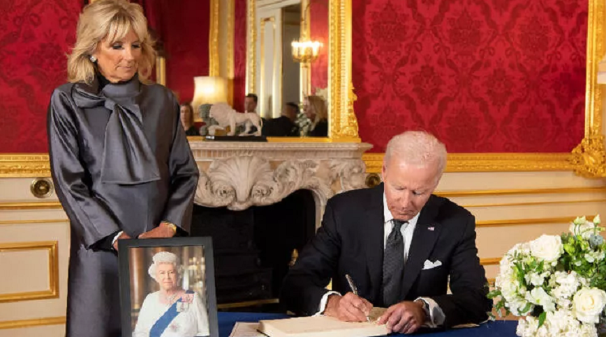 Joe Biden û hevjîna xwe, beriya beşdarî merasîmê bibin, derbasî Westminster Hallê bûn ku darbesta Keybanû Elizabeth lê ye. Hat diyarkirin ku Biden pêşî li ber darbestê rawestiyaye û rêzên xwe pêşkêş kirine.