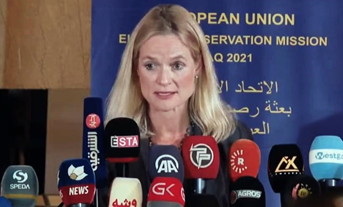 PeyamaKurd - Komîsera Yekîtiya Ewropayê (YE) ji bo Çavdêriya Proseya Hilbijartinên Iraqê Viola Von Cramon derbarê proseya dengdanê ya Iraqê de daxuyanî da û got, “Tiştê ku me dît, asta beşdariya welatiyan di proseyê de ku di demjimêrên destpêkê de gelek sist bû û di asta pêwîst de nebû.”