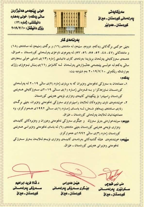 Malpera fermî ya Parlamentoya Kurdistanê daxuyaniyeke bi îmzeya seroka Parlamentoya Kurdistanê Dr. Vala Ferîd belav kir û hemû parlamenter vexwandin bo civîna roja 06.07.2019ê li parlamenê amade bin.