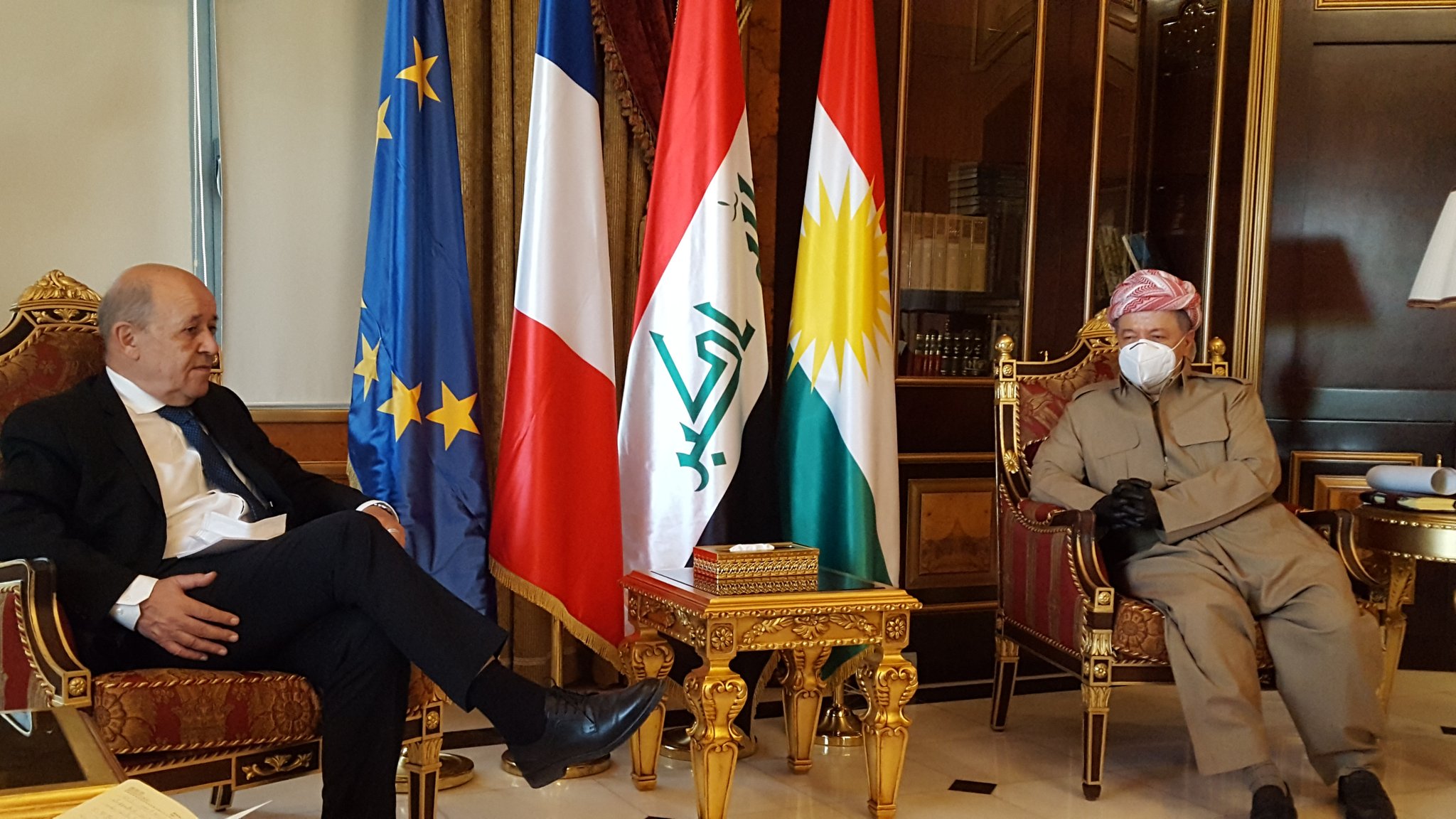Serok Mesûd Barzanî li ser hesabê xwe yê twitterê got: ‘’Ez kêfxweş bûm bi pêşwazîkirina Wezîrê Derve yê Fransayê Jean-Yves Le Drian li nivîsgeha xwe. Me behsa rewşa niha ya Iraqê kir û pêwendiyên navbera herêma Kurdistanê û Fransayê jî me guftûgo kir. Herwiha me behsa zêdetir bihêzkirina wan pêwendiyan kir.’’