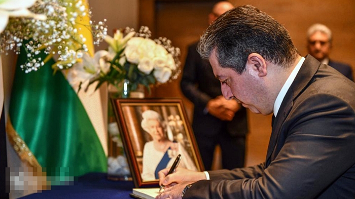 Serokwezîr Barzanî di serdanê de, lênûska taziyeya Elizabeth a Duyem ku 70 salan keybanûya Brîtanyaya Yekgirtî bû, îmze kir.