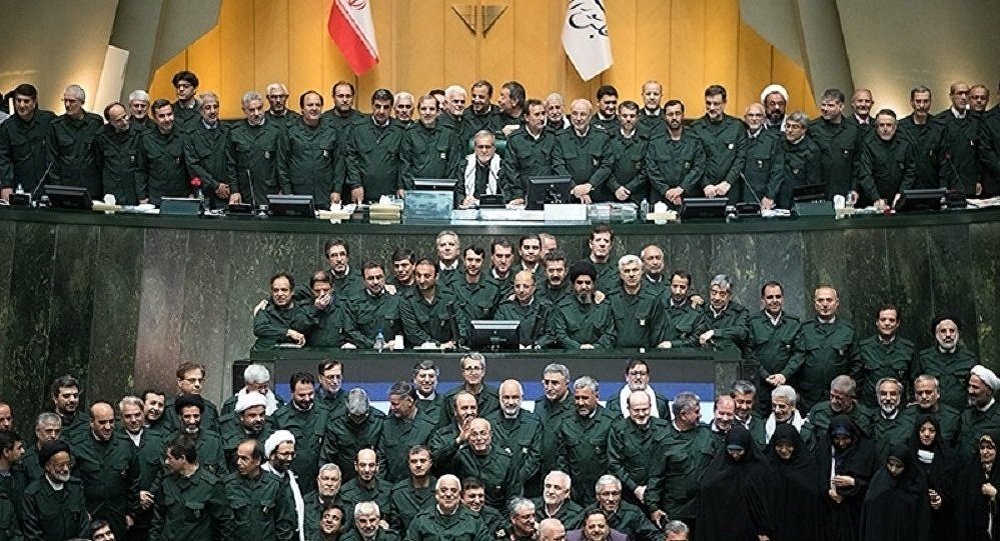 نوینەرانی پەرلەمانی شەورای ئیسلامی ئێران بە هەموو جۆرێک و لە جەرەیانی سیاسی ڕۆژی ٩ ئەم مانگە بە هۆی هەوڵی ئەمریکا لە سەر بە تێرۆریست ڕاگەیاندنی سوپای پاسداران ، جلو بەرگی سوپایان لە بەر کرد . عەلی لاریجانی سەرۆکی پەرلەمانی ئێران و مەحەمەد ڕەزا عارف بەڕێوەبەری فراکسیۆنی ئۆمید بە جلوبەرگی سوپا لە پانتایی عەلەنی پەرلەمان ئامادەبوون .