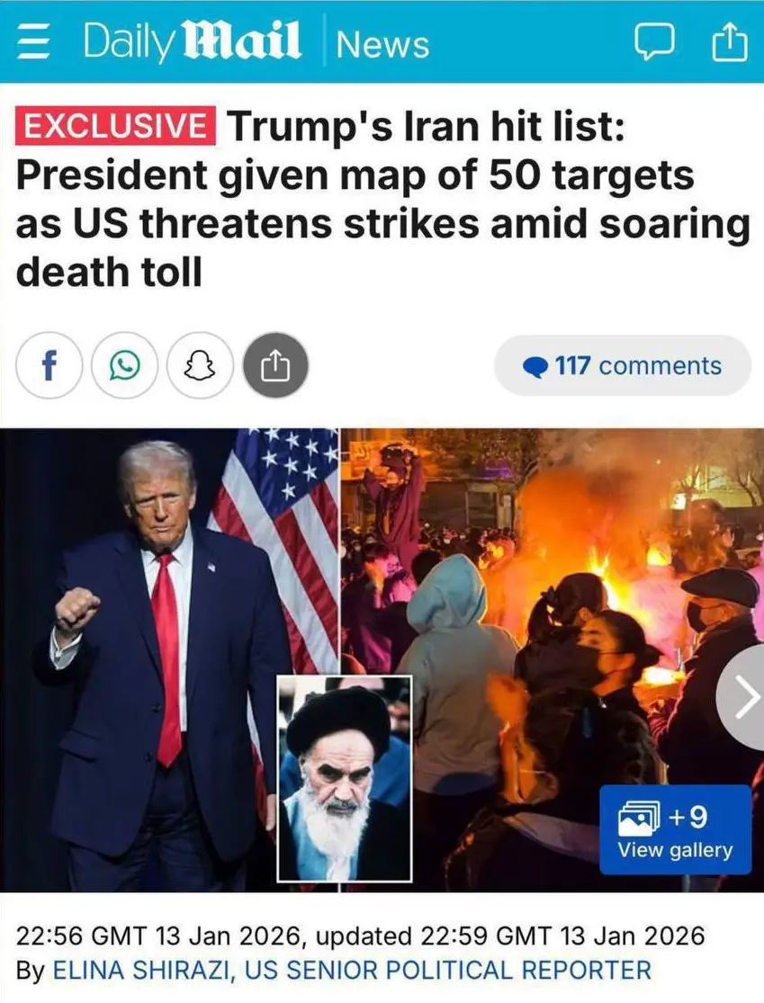 ڕۆژنامەی دەیلی مەیل ی بەریتانی لە ڕاپۆرتێکی تایبەت دا ڕایگەیاند، دۆناڵد ترامپ، سەرۆکی ئەمریکا نەخشەیەکی پێگەیشتووە کە لیستی ٥٠ ئامانجی هەستیار لە ناوخۆی ئێران لەخۆدەگرێت؛ نەخشەیەک کە لە چوارچێوەی زیادبوونی هەڕەشەکانی واشینتۆن بۆ سەر تاران و هاوكات لەگەڵ زیادبوونی زیانەکانی مرۆیی لە ناوچەکەدا ئامادە کراوە.