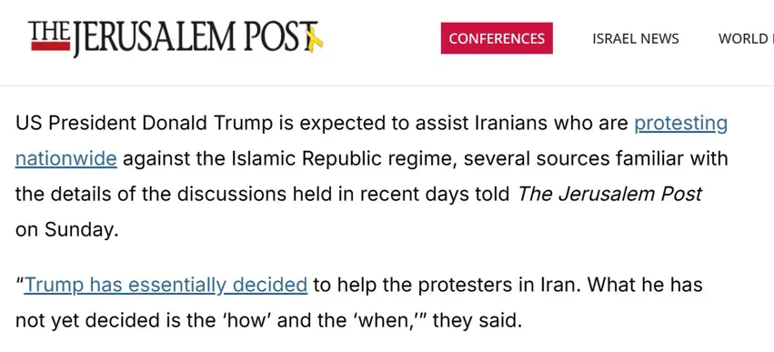 ڕۆژنامەی (ئۆرشەلیم پۆست) بە پشت بەستن بە سەرچاوە ئاگادارەکان بڵاویکردەوە، دۆناڵد ترامپ، سەرۆکكۆماری ئەمریکا بڕیاری داوە هاوکاری خۆپیشاندەرانی ئێران بکات، هەرچەندە هێشتا سەبارەت بە كات و شێوەی جێبەجێ كردنی ئەو هاوکارییە بڕیاری كۆتایی نەدراوە.
