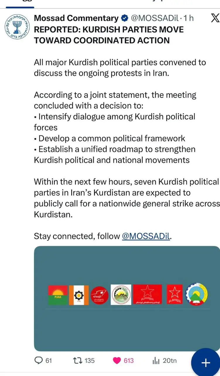 بە گوێرەی هەواڵ و زانیارییەکان ماڵپەڕی فەرمی دەزگای هەواڵگری مووساد لە بڵاوکراوەیەکی پڕ واتا هەواڵی کۆبوونەوەی حیزبەکانی ڕۆژهەڵات بە گرینگ باس دەکات و دەڵێ: پێ دەچێ ئەو حیزبانە لە چەند کاتژمێری داهاتوودا مانگرتنی گشتی ڕابگەێنن.