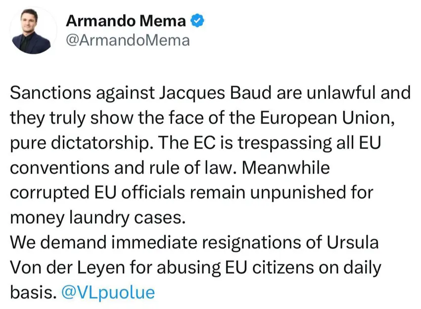🔸 ئارماندۆ ماما، ئەندامی پارتی هاوپەیمانی ئازادی فینلەندا لە X نووسیویەتی : پێویستە ئۆرسۆلا ڤۆن دێر لاین سەرۆکی کۆمیسیۆنی ئەورووپا دەست بەجێ دەست لەکاربکێشێتەوە بەهۆی ‘دەستدرێژی ڕۆژانەی هاووڵاتیانی یەکیتی ئەورووپا’.