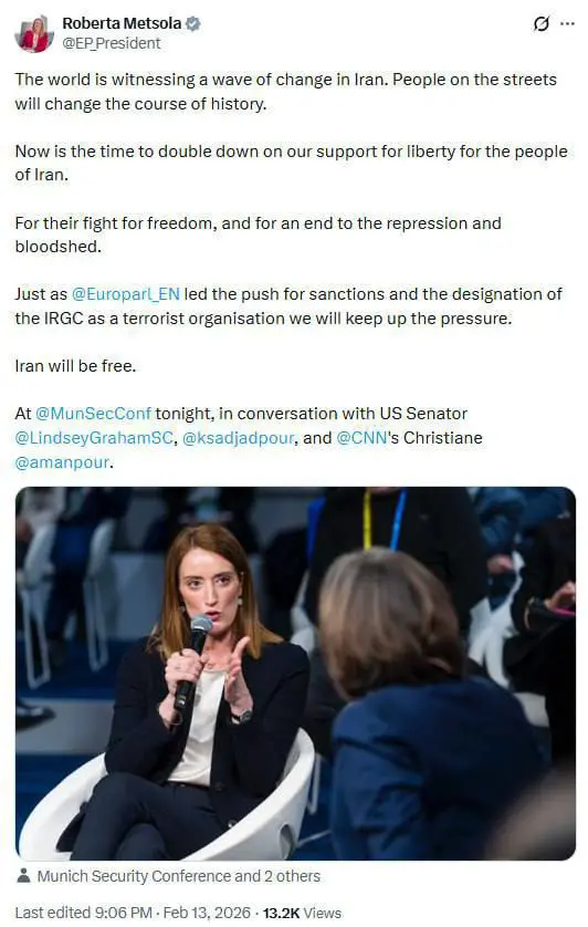 ڕۆبێرتا مێتسۆلا، سەرۆکی پەرلەمانی ئەورووپا بە ئاماژەدان بە ناڕەزایەتییە جەماوەرییەکانی ئێران، ڕایگەیاند کە جیهان شاهیدی شەپۆلێکی گۆڕانکارییە لەم ووڵاتەدا و ئەو خەڵکەی کە لە شەقامەکانن، ڕێڕەوی مێژوو دەگۆڕن.