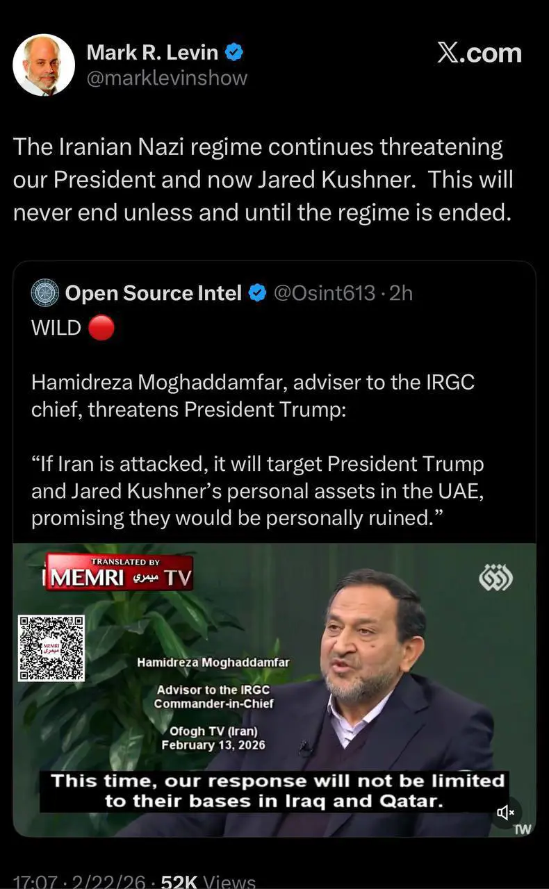 مارک لڤین : ڕژێمی نازی ئێران بەردەوامە لە هەڕەشەکردن لە ترامپ و کوشنەر؛ ئەم دۆخە تەنها بە کۆتایی هاتنی ڕژێم کۆتایی دێت