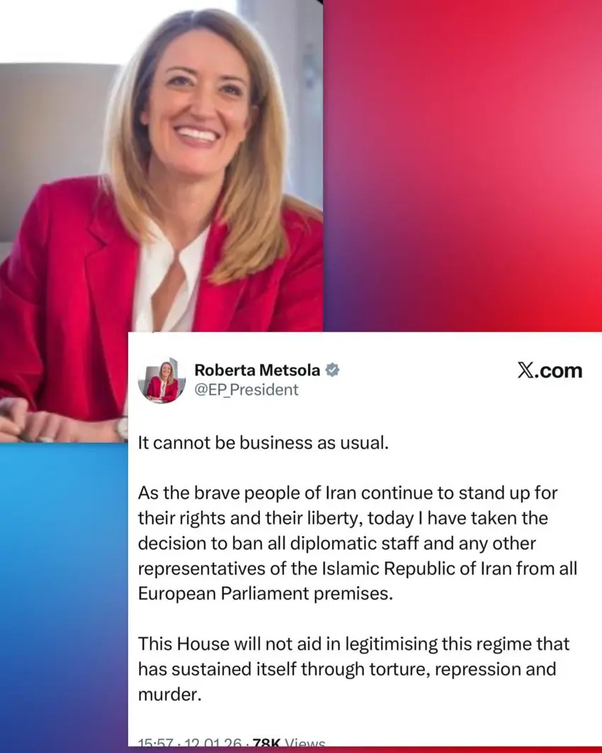 ڕۆبێرتا مێتسۆلا، سەرۆکی پەرلەمانی ئەورووپا لە بەیاننامەیەکی فەرمی دا ڕایگەیاند کە لەم ساتەوە، چوونەژوورەوەی هەموو دیپلۆماتکاران، بەرپرسان و نوێنەرانی ڕژێمی ئێران بۆ باڵەخانەکانی ئەم پەرلەمانە قەدەغەیە.