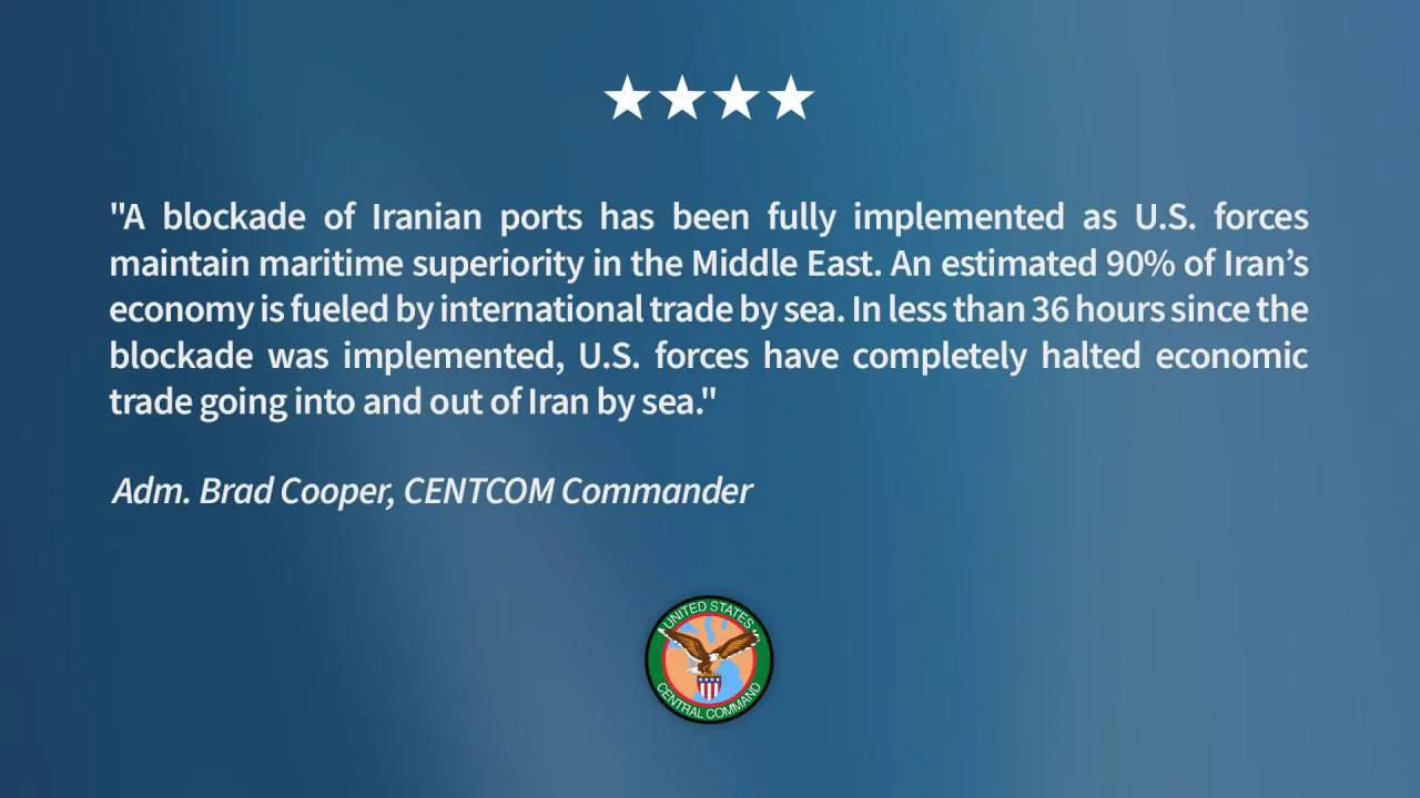 براد کوپێر، فەرماندەی سێنتکام، ئێوارەی سێشەممە لە بەیاننامەیەک دا کە لە تۆڕی کۆمەڵایەتی ئیکس بڵاوکرایەوە، وتی: "گەمارۆدانی بەندەرەکانی ئێران بەتەواوی جێ بەجێ کراوە و هێزەکانی ئەمریکا باڵادەستی دەریایی خۆیان لە ڕۆژهەڵاتی ناوەڕاستدا پاراستووە."