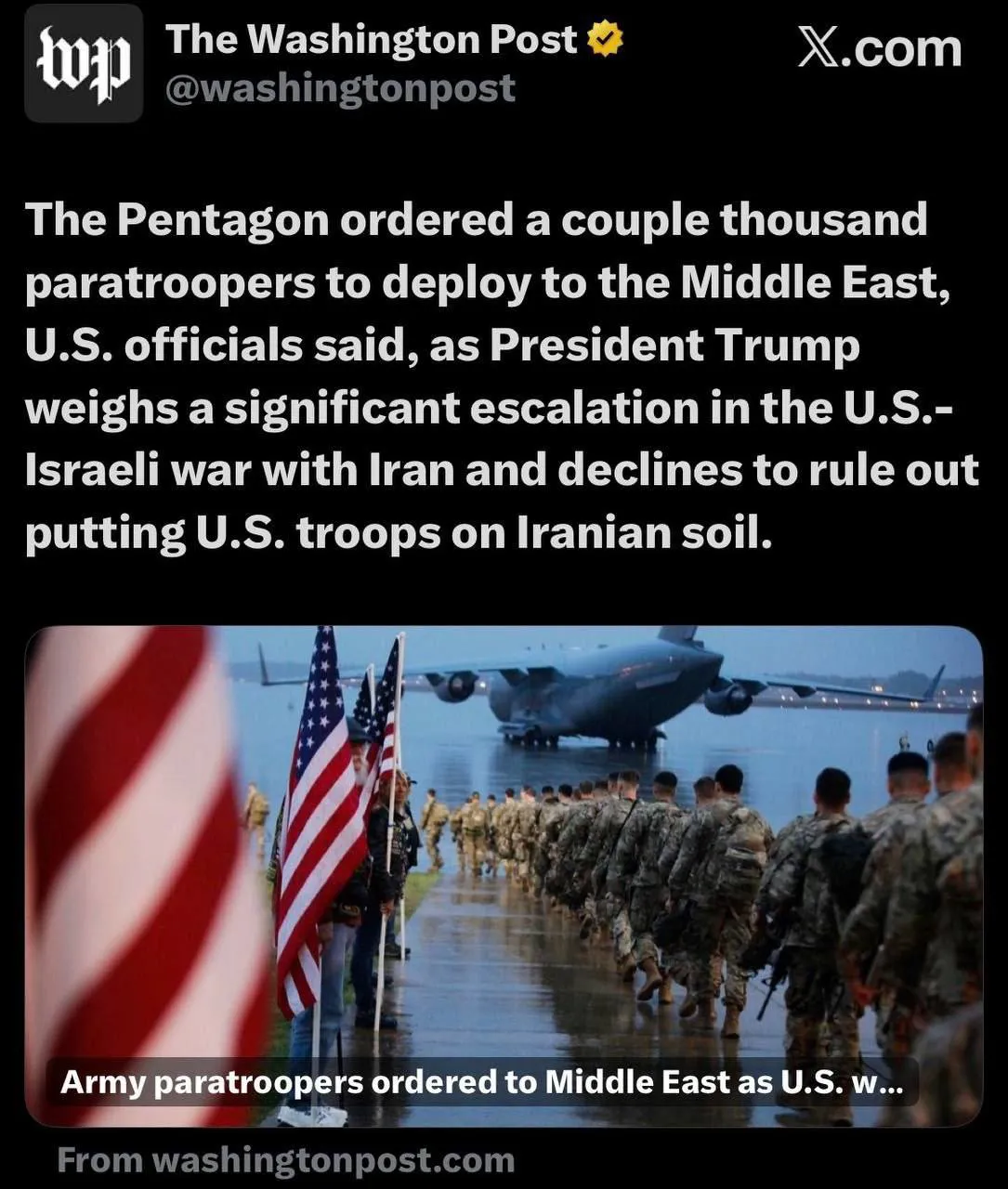 بەگوێرەی ڕاپۆرتێکی ڕۆژنامەی واشینتۆن پۆست، پێنتاگۆن فەرمانی ڕەوانەکردنی چەند هەزار چەتربازی بۆ ڕۆژهەڵاتی ناوەڕاست دەرکردووە. ئەم بڕیارە لە کاتێک دا دراوە کە سەرۆک کۆماری ئەمریکا بژاردە بۆ پەرەپێدانی ململانێ لەگەڵ کۆماری ئیسلامی تاوتوێ دەکات و ئەگەری جێگیركردنی هێزی ئەمریکی بۆ ئێرانی بەدوور نەگرتووە.