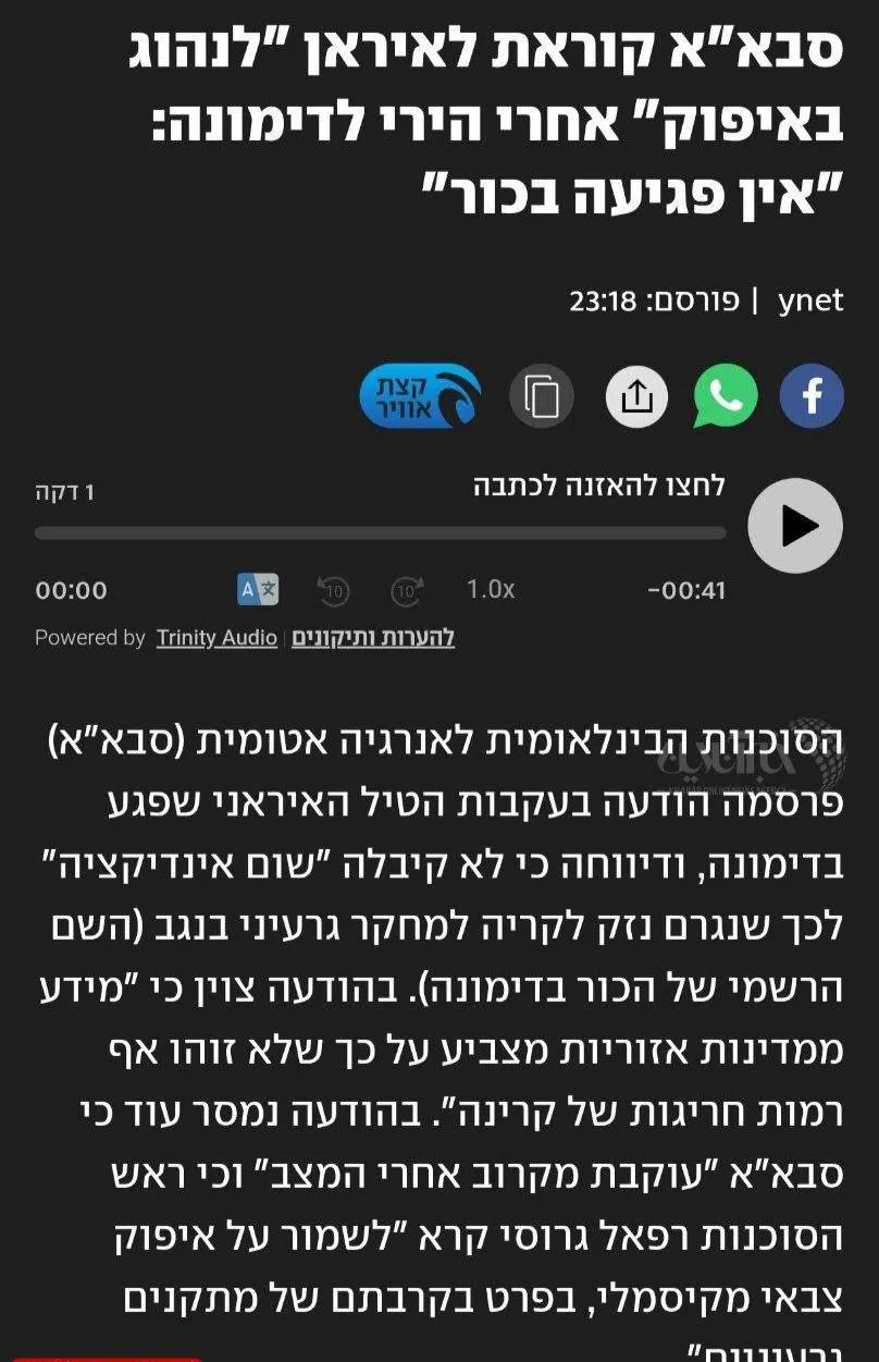 ڕۆژنامەی یەدیوت ئاحارۆنووت ڕایگەیاند : ڕێکخراوی ووزەی ئەتۆمی ئیسرائیل داوا لە ئێران دەکات خۆی بگرێت.