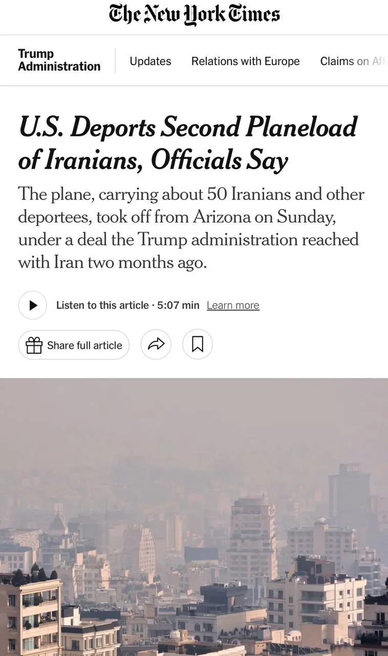 بە پێی ڕاپۆرتێکی نیۆیۆرک تایمز، یەکشەممە دووەم فڕۆکەی دیپۆرتکردنەوەی ٥٠ هاووڵاتی ئێرانی و چەند کەسێکی عەرەب و ڕووس، لە ئەریزۆنای ئەمریکاوە هەڵفری و سەرەتا لە میسر نیشتووەتەوە و ڕووس و عەرەبە دیپۆرت کراوەکانی دابەزاندووە و ئێرانییەکانی بردووەتە کوەیت و لەوێوە بە فڕۆکەیەکی کوەیتی گەێندراونەتە تاران.