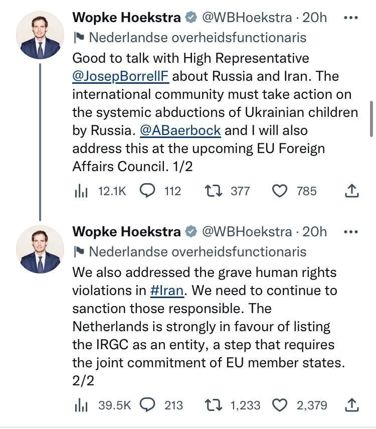 ڤۆپکە هۆکسترا، وەزیری دەرەوەی هۆلەندا ڕایگەیاند لەگەڵ جۆزێپ بورل، بەرپرسی سیاسەتی دەرەوەی یەکیتی ئەورووپا ڕایگەیاند و بڵاوی کردەوە: «لەبارەی پێشێلکردنی مافی مرۆڤ لە ئێران دا گفتوگۆمان کرد».