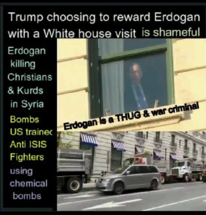 ئەردۆغان پێش چاوپێکەوتنی سەر لە بەیانی خۆی لەگەڵ دۆناڵد ترامپ سەرۆککۆماری ئەمریکا لە هۆتێلی ویلارد لە واشینتۆن دی سی جێگیر بووە و بە پەلە لە پەنجەرەی ژوورەکەی دەرەوەی ناوچەکە تەماشا دەکات تاکوو ببینێت کە ئایا خۆپیشاندان و دەربڕینی ناڕەزایەتی لەوێ بوونی هەیە ، لە هەمان کاتدا بە سەدان پۆلیس و کامیۆنی ئەمنییەتی لە دەورووبەری هۆتێلەکە بۆ ئەمنییەت و پاراستنی لەوێ جێگیر کراون .