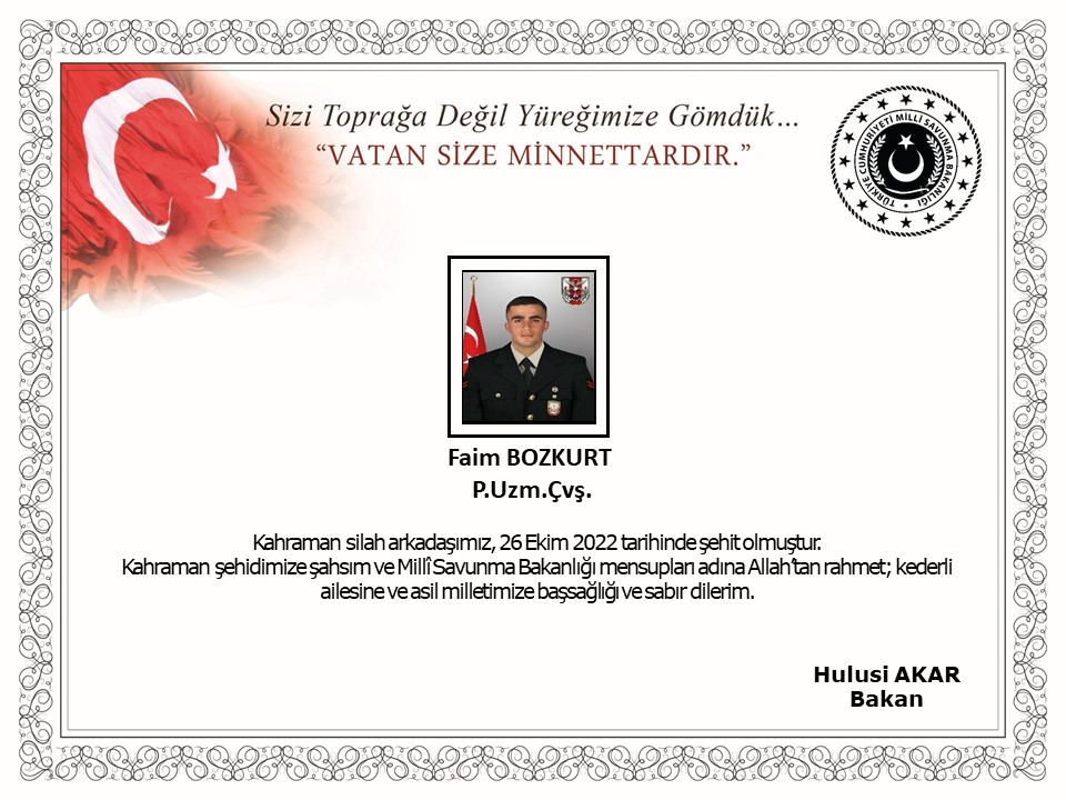 وەزارەتی بەرگریی توركیا رایگەیاند، رۆژی چوارشەممە سەربازێكیان بەھۆی پێكدادانەكانەوە لە ناوچەی “ئۆپراسیۆنی چڕنووك-قووفڵ لە ھەرێمی كوردستان” برینداربووە و دواتر بەھۆی سەختی برینەكەیەوە گیانی لەدەستداوە.