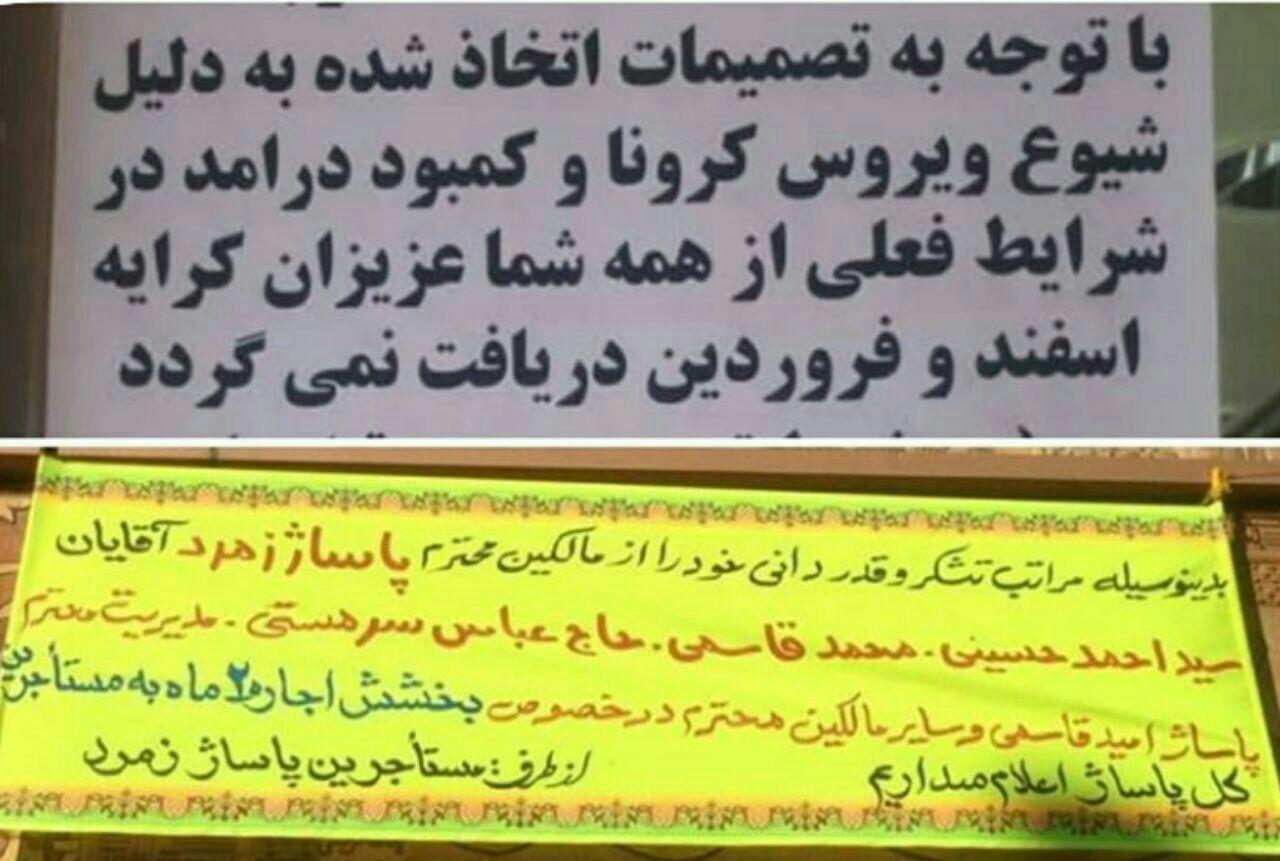 ژمارەیک لە خاوەن دووکانان لە پارێزگای سنە بە هۆی دۆخی بالەباری ئابووری و نەخۆشی و گرانی لەو شارە بە کۆمەڵ بڕیارێکیان بە هاودەنگی یەکتر ڕاگەیاندووە کە ئەمە دەقەکەیەتی : : بەم شیوەی سوپاسی و پیزانینی خۆمان وەک خاوەندارانی دووکانەکان ڕادەگەێنین بە گرینگیدان بە لەبەر گرتنی هەندێک ڕیکار بە هۆی بڵاو بوونەوەی نەخۆشی کۆرۆنا و نەبوونی دەرئامەد و خەرجی لە دۆخی ئێستادا لە هەموو ئێوە ئازیزان کرێ دوو مانگ وەرناگیرێت