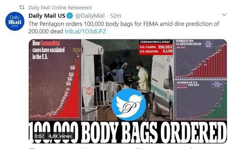 بە پێی هەواڵەکان پێنتاگۆن لە ڕاسپاردەیەکدا داوای ئامادەکردنی ١٠٠ هەزار کیسەی تایبەت بە دانانی لاشەی مردووان کردووە .