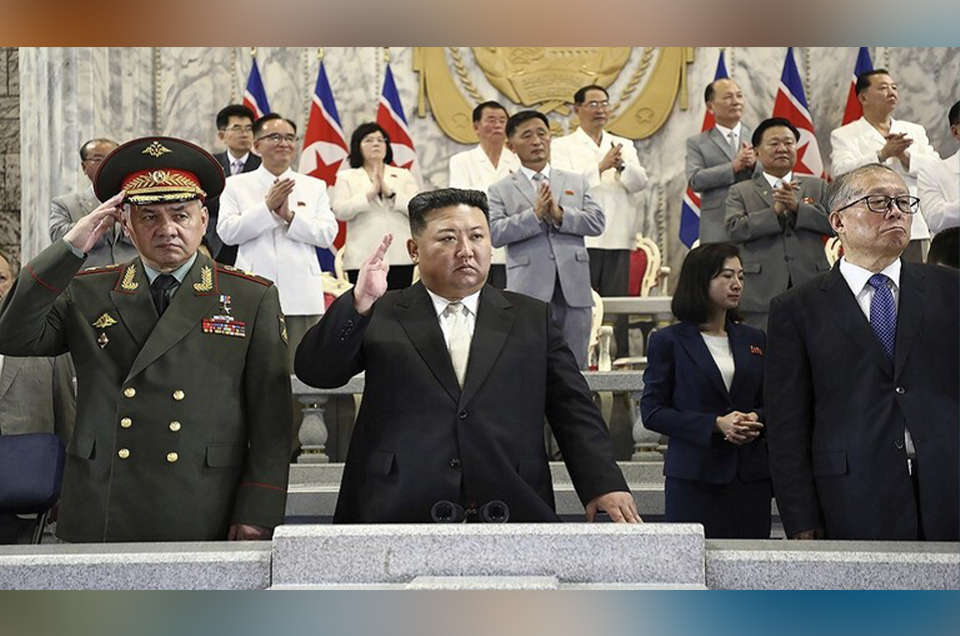 دەزگای هەواڵی ناوەندی کۆریای باکوور بەرپرسانی چین و ڕووسیای پیشان دا کە شان بە شانی ڕابەری کۆریای باکوور کیم جۆنگ ئون وەستابوون لە کاتێکدا کە سەیری نوێترین موشەک و فڕۆکە بێفڕۆکەوانە هێرشبەرەکانییان دەکرد لە میانەی نمایشێکی سەربازییدا لە پیۆنگیانگی پایتەختی کۆریای باکوور.