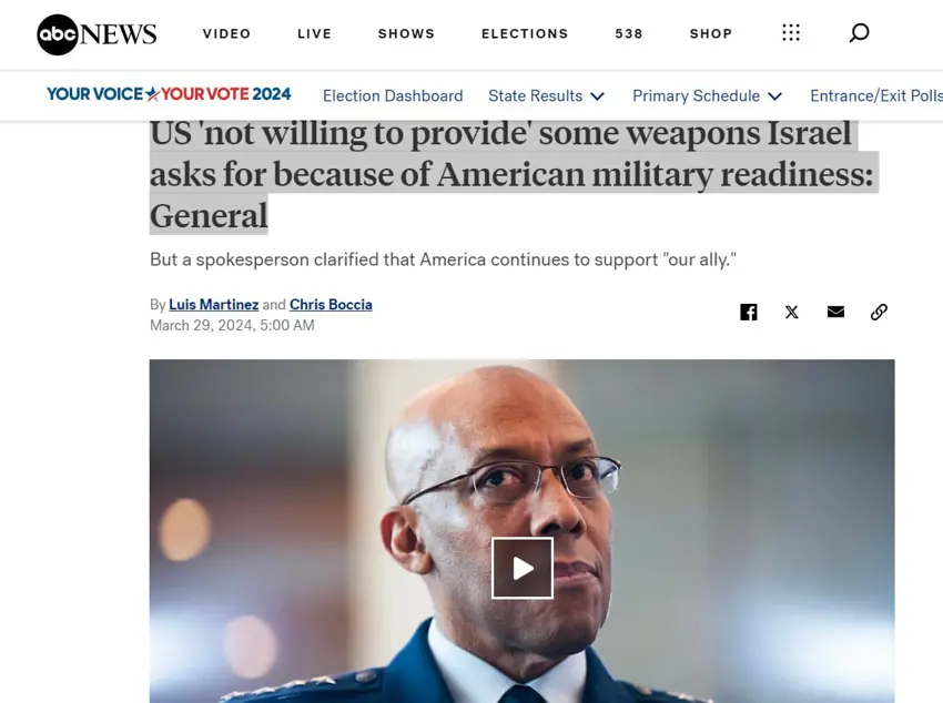 چارڵز براون سەرۆکی ئەرکانی ھاوبەشی سوپای ئەمریکا ووتی ؛ ھەرچەندە ئەمریکا پشتگیری سەربازی ئیسرائیلی کردووە ، بەڵام ھەموو ئەو چەکانەشیان دەست نەکەوتووە کە داوایان لێکردوون، ئەوەش بەشێکە لە سیاسەتی واشینتۆن کە نایەوێت لە ئێستادا دابینی بکات.