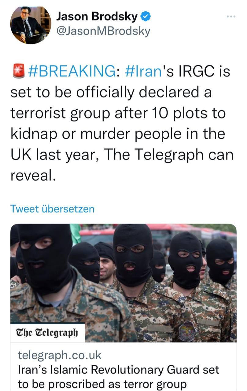 سەرچاوەیەکی ئاگادار بە ڕۆژنامەی تێلێگراف یان ووتووە لە هەفتەکانی داهاتوو دەوڵەتی بەریتانیا ، سوپای پاسداران دەخاتە لیستەی تێرۆرەوە . وەزیرانی ووڵات و ئەمنییەتی بەریتانیا لە پاڵپشتیکارانی ئەم پلانەن .