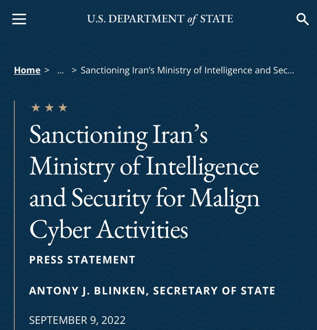 ئەمریکا وەزارەتی ئیتلاعاتی کۆماری ئیسلامی و ئیسماعیل خەتیب وەزیری ئیتلاعاتی ئەم ڕێژیمەی خستووەتە نێو لیستی گەمارۆکان، چوونکە بەشدار بوونە لە هێرشە ئێلێکترۆنییەکانی دژ بە ئەمریکا و هاوپەیمانەکانی.