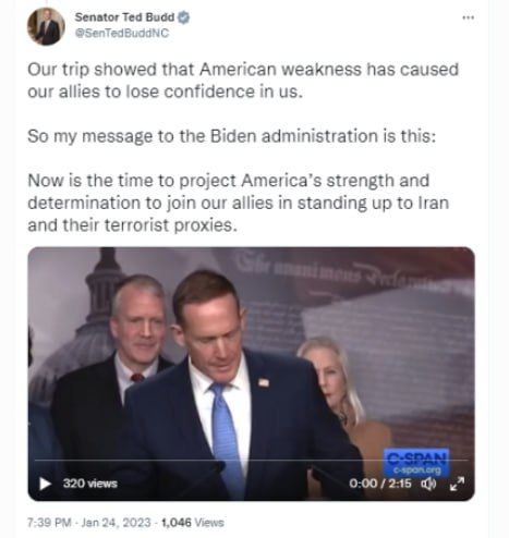 سێناتۆر تێد بۆد ئەندامی ناوەندی بانکداری سێنای ئەمریکا ڕایگەیاند : پەیامی من بۆ دەوڵەتی بایدن ئەوەیە ئێستا کاتی دەرخستنی دەسەڵات و ئیرادەی ئەمریکا و هاوپەیمانەکانیەتی بەرانبەر بە کۆماری ئیسلامی و پرۆکسییە تیرۆریستیەکانی.