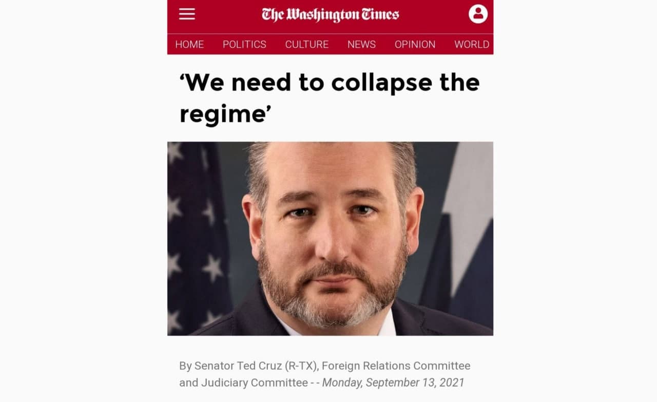 بە پێى ڕاپۆرتى وەرگێڕدراوى ئاڤاتودەى، سیناتۆر تێد کرووز بە بڵاوکردنەوەى وتارێک لە ڕۆژنامەى واشینتۆن تایمز و بە ڕاگەیاندنى ئەوەى کە چالاکى و کردە شەڕەنگێزییەکانى کۆمارى ئیسلامى بە تەواوى ناسێنراون، نووسى: کۆمارى ئیسلامى بە دواى دروستکردنى مووشەک، لەناوبردنى ئەمریکا و هاوپەیمانەکانى بەتایبەت ئیسرائیل، درووستکردنى گرووپگەلى تیرۆریستى لە نێوخۆى عێراق و یەمەت و لوبنان و پشتیوانى ماددى و ئاراستەکردنى تیرۆریزم لە هەموو دونیا، خەریکى ئەنجامدانى تاوانى دژە مرۆڤییە.