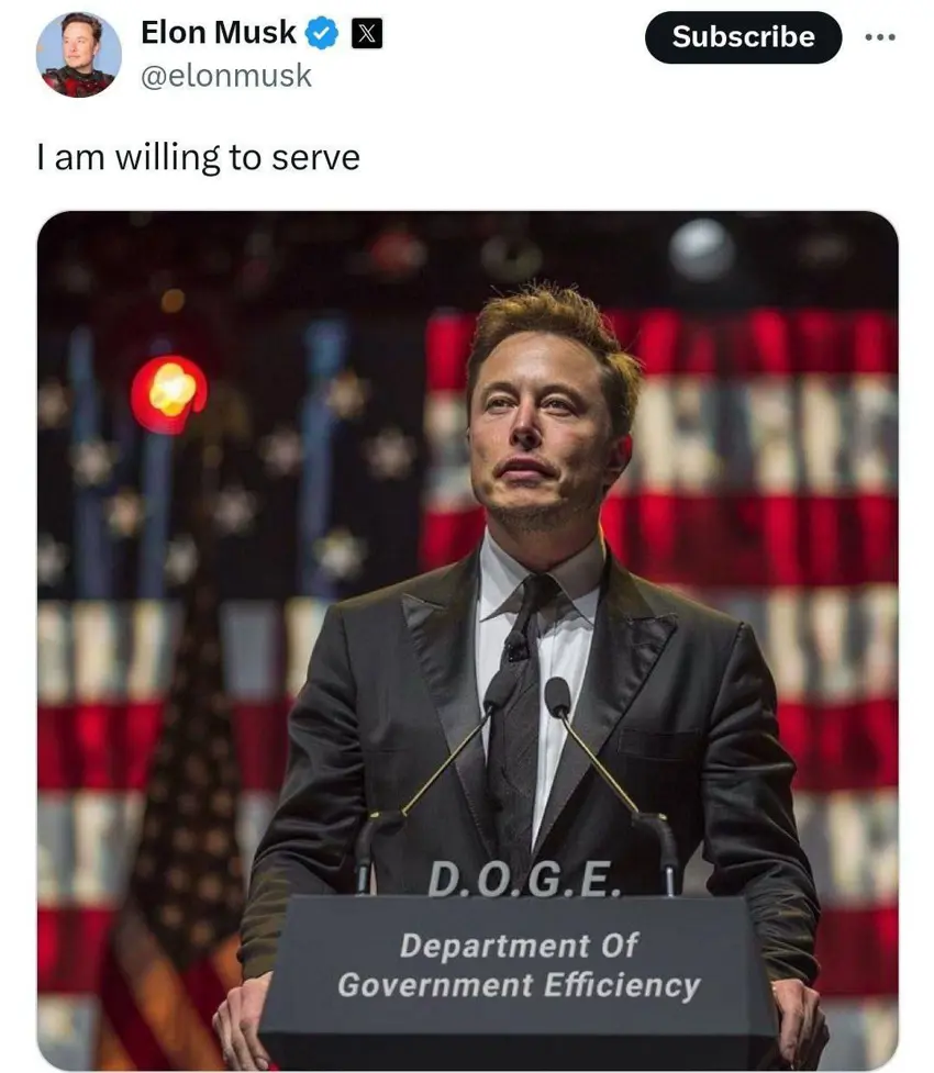 بەپێی زانیارییەکان ئیلۆن ماسک پێشنیاری پۆستی کابینەی ترەمپی قبووڵکردووە بە بڵاوکردنەوەی پۆستێک لەسەر پلاتفۆرمی ئێکس کە نووسیویەتی: "ئامادەم بۆ خزمەتکردن".
