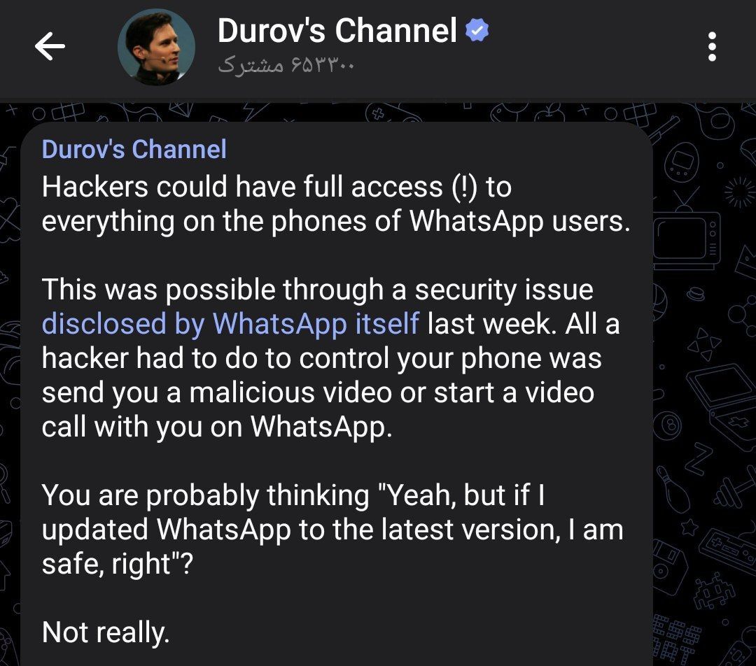 مة لێرەوە فشار ناخەمە سەر خەڵک کە ڕوو بکەنە تێلێگرام . بە زیاتر لە ٧٠٠ میلیۆن بەکارهێنەری چالاک و زیاتر لە ٢ میلیۆن دامەزراندنی ناوی ڕۆژانە ، تێلێگرام پیویستی بە ڕیکلامی زیادە نییە . دەتوانن لە هەر بەرنامەیەکی پەیام گەیان کە حەز دەکەن کەڵک وەربگرن بەڵام لە واتس ئاپ دوور بگرن ، ئێستا ١٣ ساڵە کە ئامرازێکی چاودێری یە .