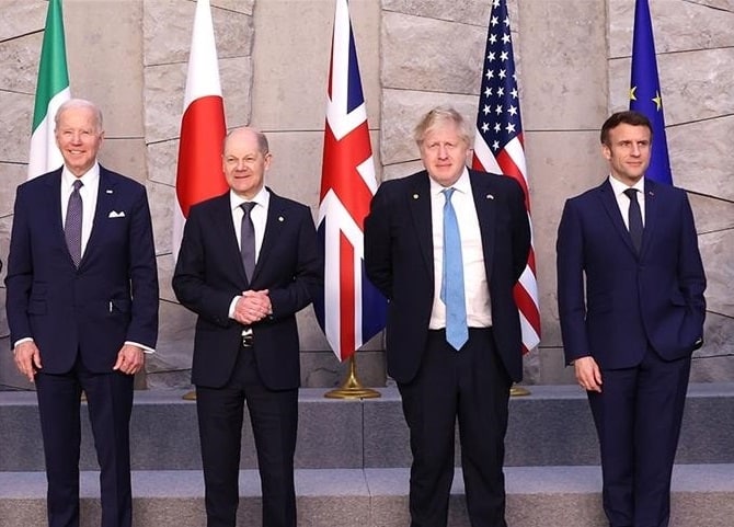 بۆریس جانسن سەرۆکوەزیرانی کاتی بەریتانیا ، ئێمانۆئێل ماکرۆن سەرۆککۆماری فەڕەنسا ، ئۆڵاف شۆڵتز گەورە ڕاوێژکاری ئاڵمانیا و جۆ بایدن سەرۆککۆماری ئەمریکا لە پەیوەندییەکی تەلەفۆنی هاوبەشدا پێکەوە گفتووگۆیان کرد .